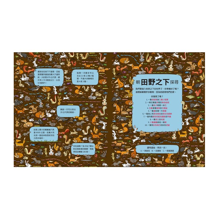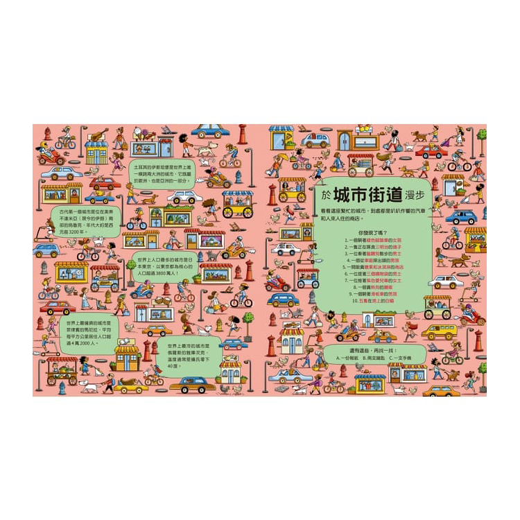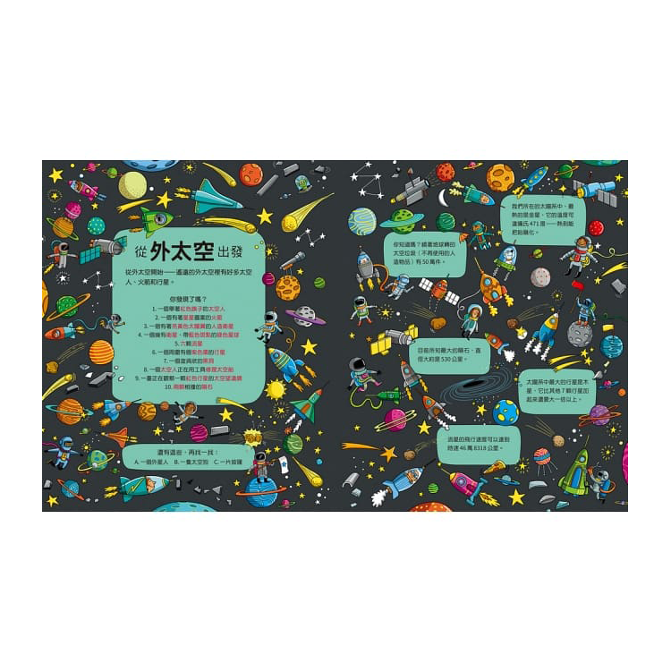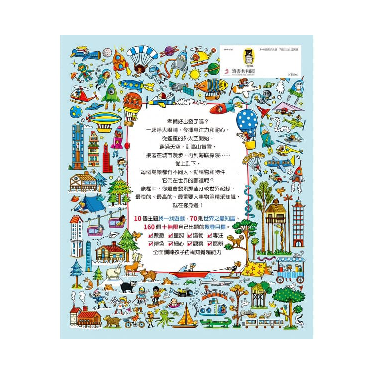 準備好出發了嗎?一起睜大眼睛、發揮專注力和耐心,從遙遠的外太空開始,穿過天空,到高山賞雪,接著在城市漫步,再到海底探險……從上到下,每個場景都有不同人、動植物和物件,它們在世界的哪裡呢?旅程中,你還會發現那些打破世界紀錄,最快的、最高的、最重要人事物等精采知識,就在你身邊!