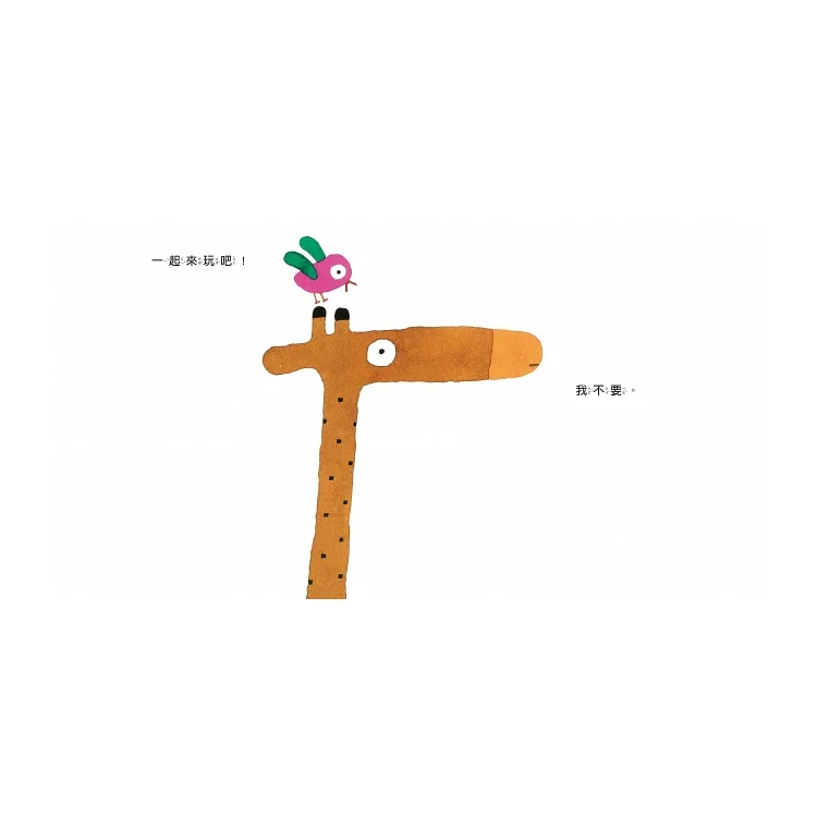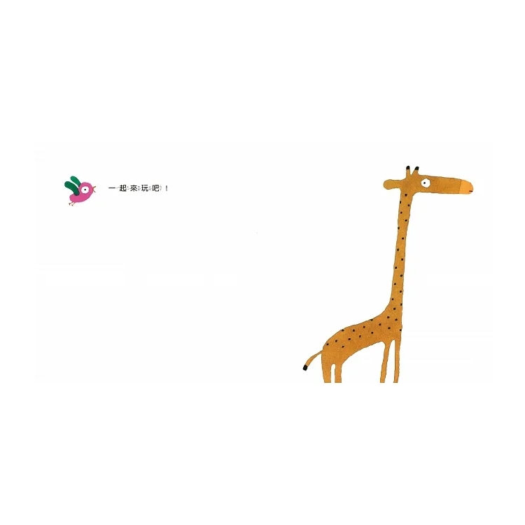 小鳥飛到長頸鹿身旁,希望可以跟長頸鹿一起玩。牠說:「一起來玩吧。」但長頸鹿卻說:「我不要。」雖然一頁頁重複著「一起來玩吧。」和「我不要。」,卻發現圖畫上有巧妙的安排──小鳥和長頸鹿早就玩起來啦!他們玩了什麼呢? 哇有彎一彎身子、躲貓貓、找一找……。現在就一邊讀,一邊跟著動一動身體吧!