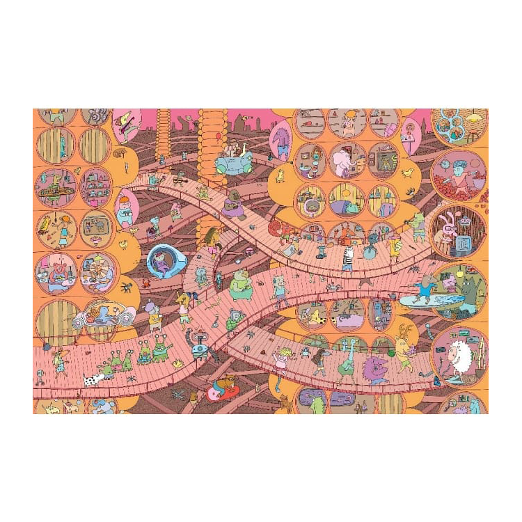 講述奇幻小鎮MAMOKO未來某一天中所發生的故事。書裡描述一千年以後的世界是什麼面貌,讓孩子翻開一張張圖畫,比比看,在衣食住行及娛樂上,跟現代生活有什麼不同。讓孩子跟著乘著飛行器的小熊,飛過層層疊疊的高架橋,見識超大型機器人,也看到許多外星人,孩子的眼界大開,想像也隨之飛馳起來了……。