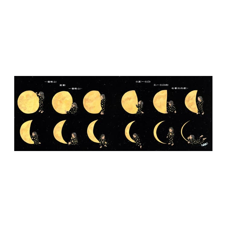 在這個充滿想像力的原創故事裡,凱迪克銀牌獎、紐伯瑞文學獎銀獎得主林珮思,巧妙結合了中秋節、月餅與月相變化,再揉進母女間濃濃的愛,創作出一則暖心又甜蜜的現代童話。整本書既奇幻又寫實,在全黑的書頁上,小星和媽媽彷彿生活在宇宙星空中,瀰漫著一股超現實的神祕感,然而她們母女間的親子互動卻又非常真實,小星調皮的神情和可愛的笑容,就像鄰家小女孩一樣親切。