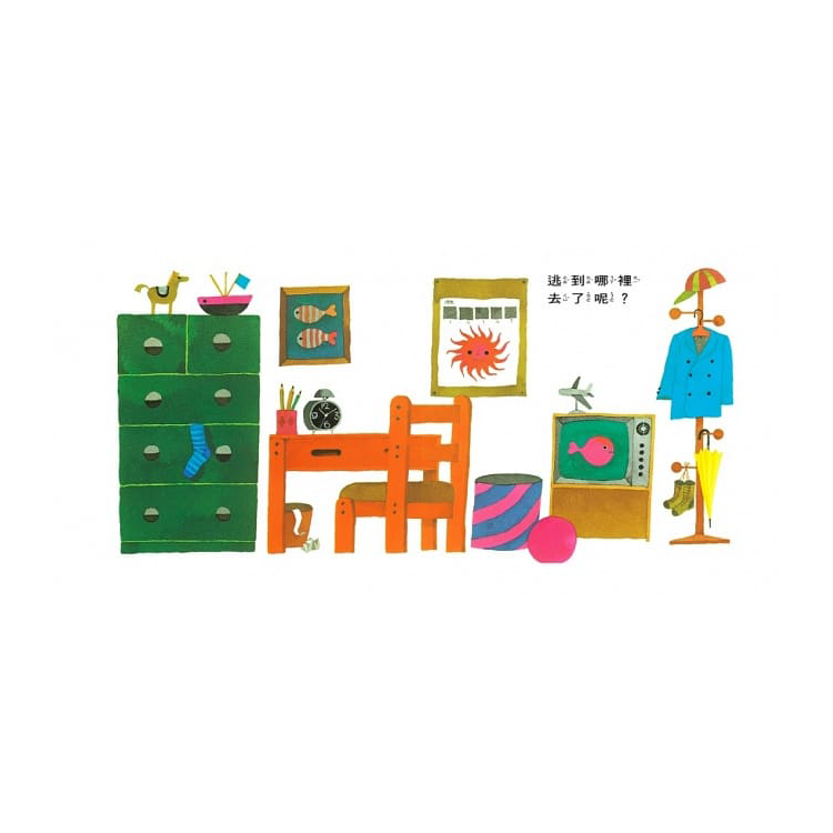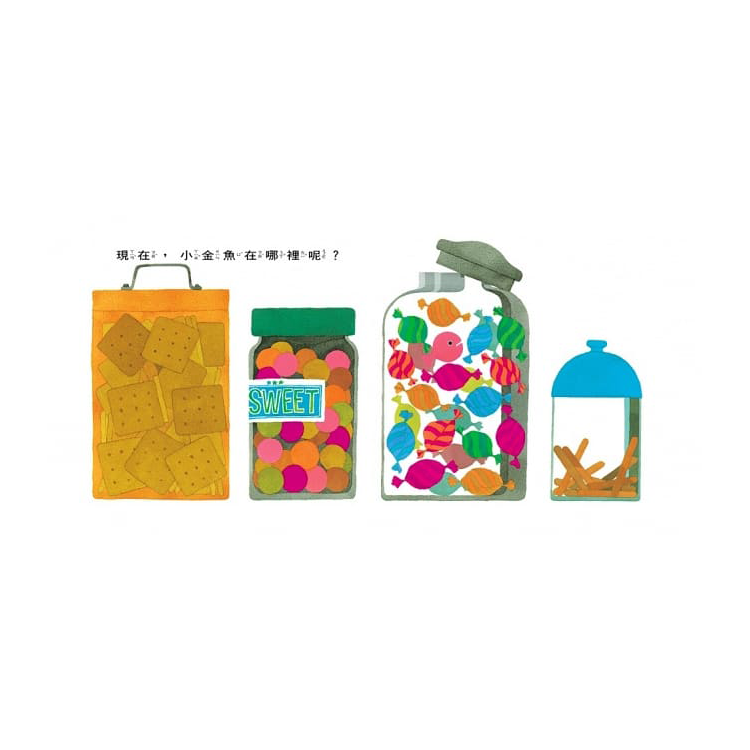 是窗簾上的紅點點、花盆裡的紅花、還是糖果罐裡的糖果?作者五味太郎用天馬行空的聯想力以及巧妙的安排設計,讓小金魚「躲」進各個常見的生活場景裡,邀請孩子們一起來玩躲貓貓的遊戲,在相近的色彩與形狀中,仔細尋找小金魚躲藏的地方,並在閱讀過程裡,充分享受「找到了」的樂趣。