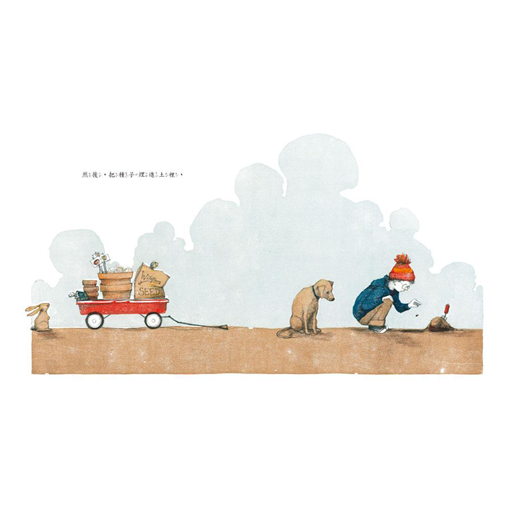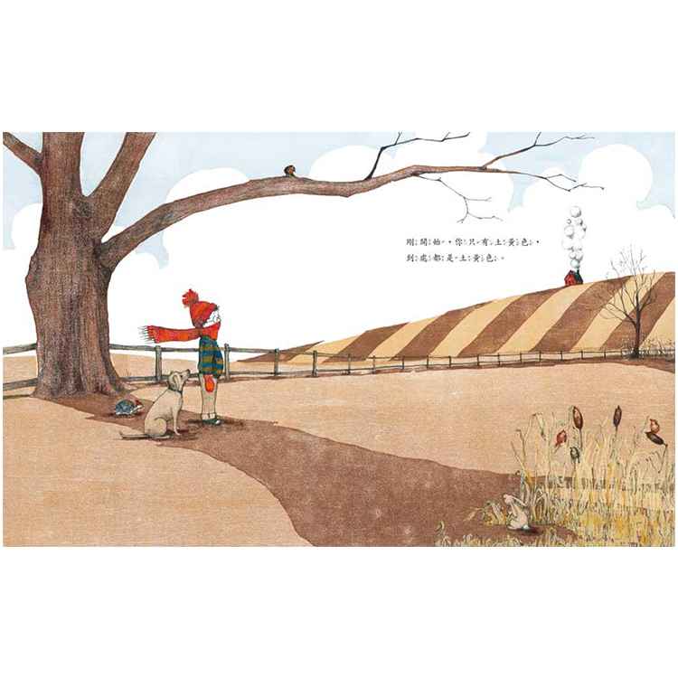 度過了白雪覆蓋的冬天,小男孩和他的小狗受夠了遍地土黃,他們決定栽種一個花園。他們挖土、埋下種子、遊戲和等待……持續等待……直到最後,土黃色中出現了希望的生機,春天終於悄悄來了。
