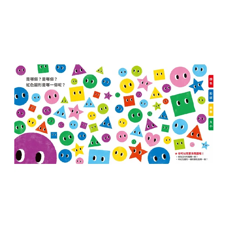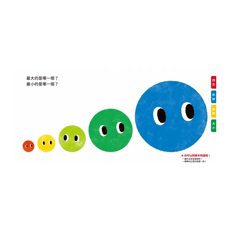 可愛、高彩度的手繪圖案,能有效吸引幼兒的專注力。根據幼兒發展設計,圖像由大到小,數量由少到多,問題由簡入深。簡潔的圖案加上眼睛等細節,可以從各種角度去觀察描述,例如貫穿全書的主角「紅色圓形」,藉由詢問讓孩子能回答顏色是紅色,形狀是圓形,還有眼睛向左看或笑咪咪等。