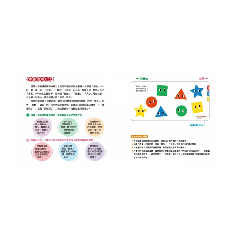 多變化玩法,引導孩子在互動中玩出更多令人驚喜的隱藏版問答。書中不僅列出引導句、延伸問句,還有主題標示,如「形狀」、「顏色」、「數量」、「大小」等,只要改變提問方式和句型,就能一直互動,新手爸媽也能輕鬆運用,發揮創意玩出更多樣、更深入的問答。從0歲一路玩到學齡前,不同年齡可以玩出不同的樂趣。